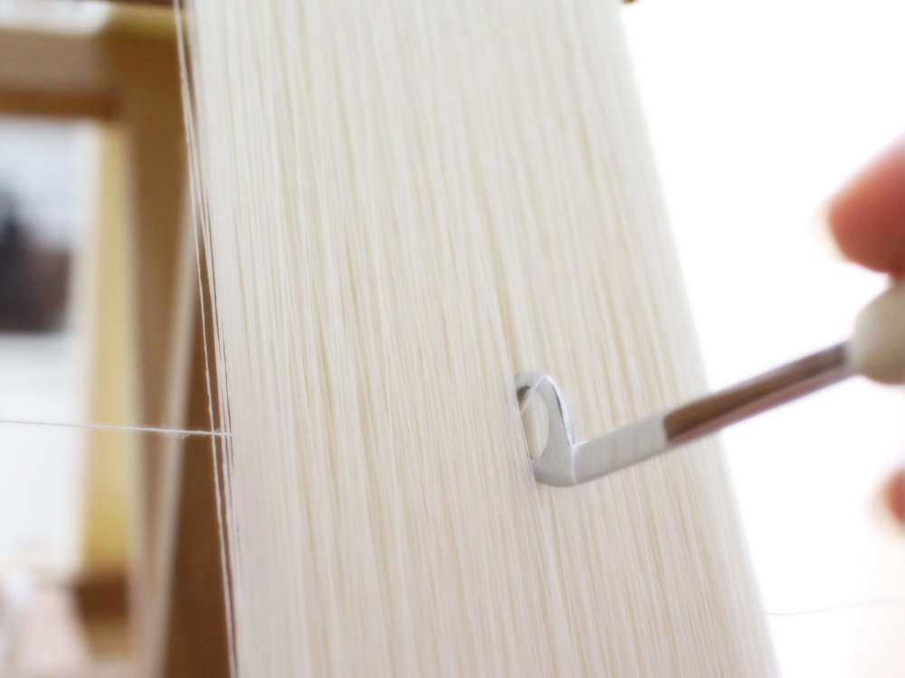 糸と‘シャトル’と呼ばれる舟形の糸巻きを使って編み上げる‘タディングレース‘という技法で作られています。結び目の